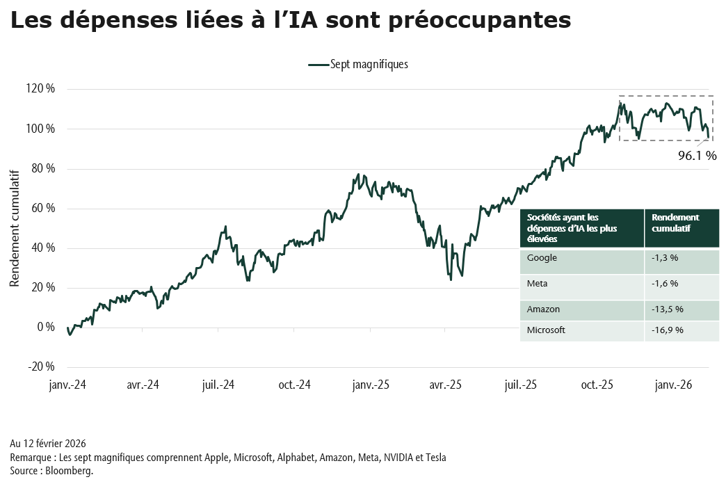 Les investisseurs craignent de plus en plus que la course concurrentielle pour la position de tête en IA mène à des dépenses excessives et une mauvaise affectation des capitaux. Les résultats pourraient encore se concrétiser, mais la trajectoire vers la monétisation demeure incertaine et pourrait prendre plus de temps que ce que les marchés avaient prévu initialement.