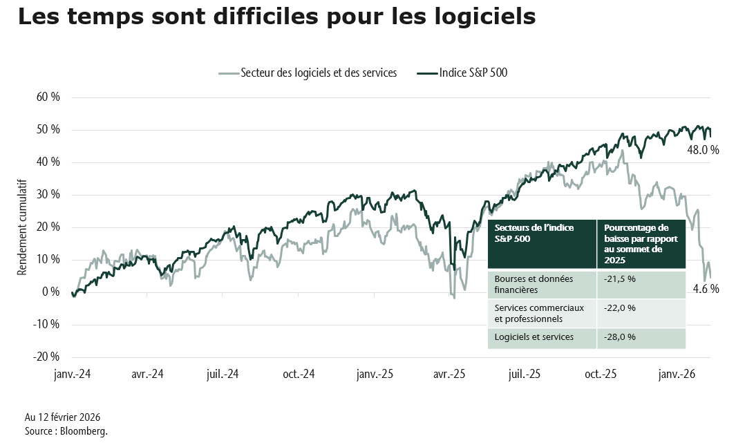 Les sociétés de logiciels ont été les plus durement touchées par le récent repli. Au début du cycle de l’IA, elles ont profité de l’intégration de l’IA dans leurs produits et de la tarification de fonctionnalités améliorées. Aujourd’hui, la situation a changé. L’IA est de plus en plus perçue non seulement comme une amélioration, mais aussi comme un outil de remplacement potentiel.