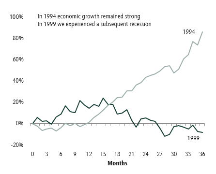 While averages can be helpful, they don’t tell the whole story. In the chart, we show the best and worst three year period following the start of rate increases. What is key here is that growth in the economy and earnings remain positive and don’t contract. In the 1999 cycle, rates increased, growth slowed, and we entered an economic recession that coincided with the tech bubble. At the other end of the spectrum, economic growth slowed but reaccelerated without contracting during the 1994 cycle. So the main message is that what happens to economic growth is of utmost importance.