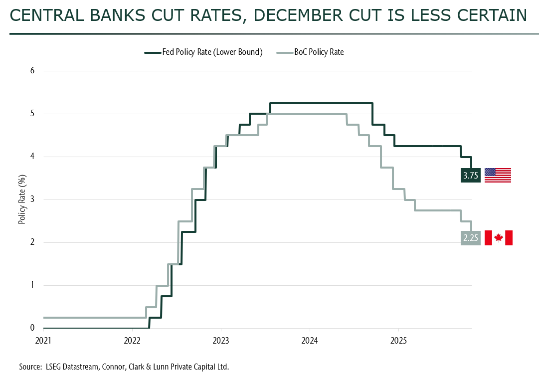 This week the United States (US) Federal Reserve (Fed) and the Bank of Canada (BoC) cut rates by 0.25%. While this was widely expected, bond and stock markets initially moved lower. The volatility came from the forward guidance provided by the central