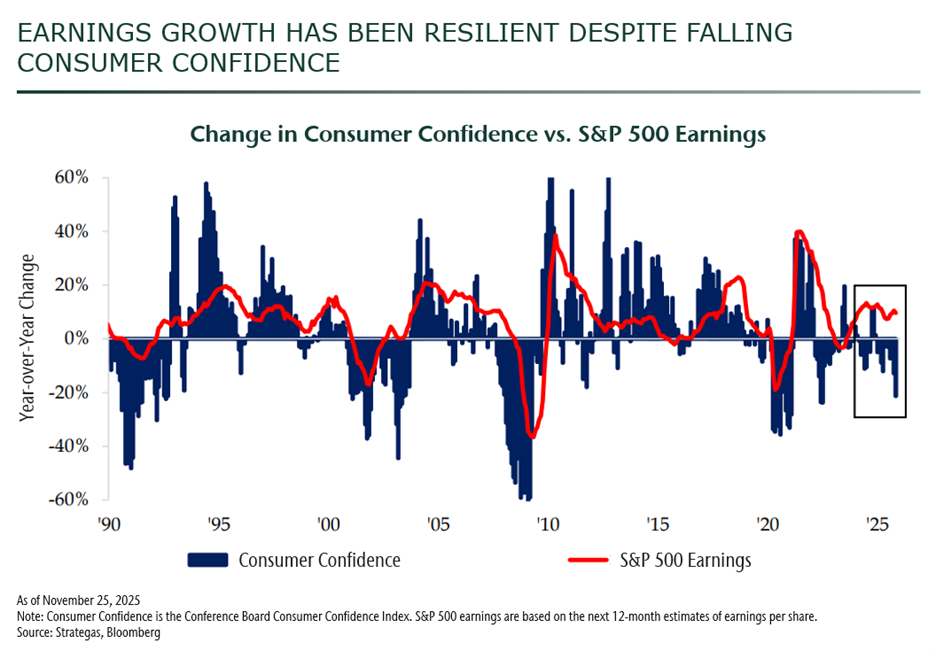 Historically, consumer confidence and earnings growth move together. Today, they are diverging and we think that this gap could persist for two reasons: