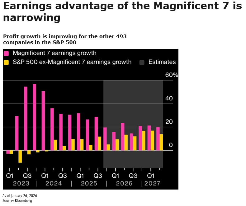 Earnings leadership is beginning to broaden across the US market. While the “Magnificent 7” continues to deliver profit growth, earnings growth across the rest of the S&P 500 is improving, narrowing the gap after a period of high concentration. This convergence points to increasing opportunities beyond the largest technology stocks, particularly among companies with strengthening fundamentals and more attractive valuations.