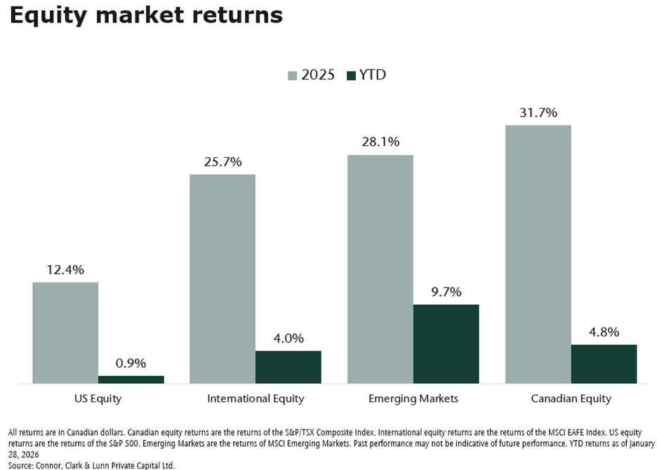 - Equity markets posted exceptional returns for a third consecutive year in 2025, with Canadian, emerging market, and developed international stocks outperforming.