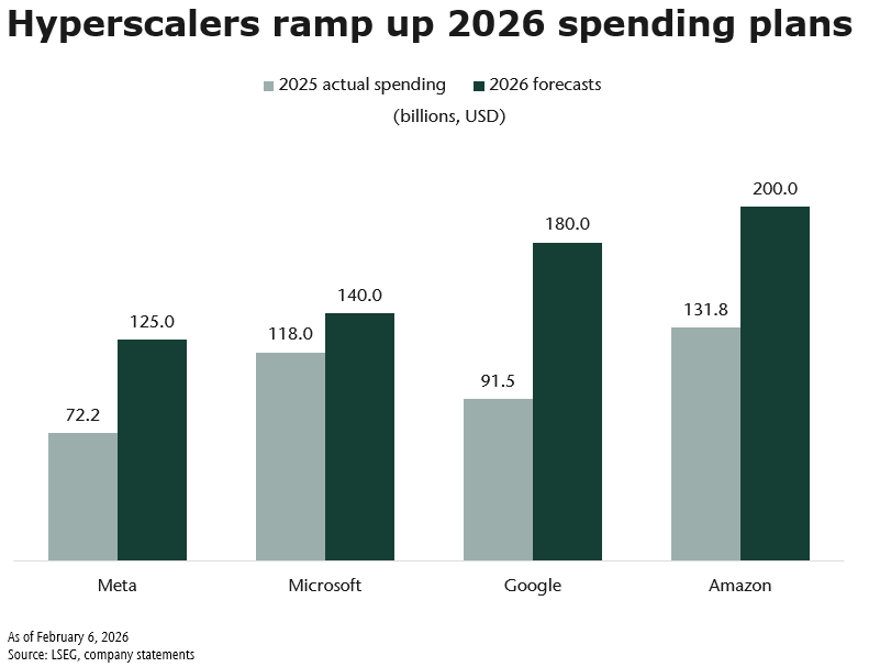 Markets have reacted swiftly. Amazon shares sold off after announcing plans to invest $200 billion this year, while Microsoft experienced its largest drawdown since 2020 following record quarterly capital expenditures and signs of moderating cloud growth. The message from markets has been consistent: investors are not questioning the importance of AI, but they are debating the pace, timing, and ultimate return on this wave of spending.